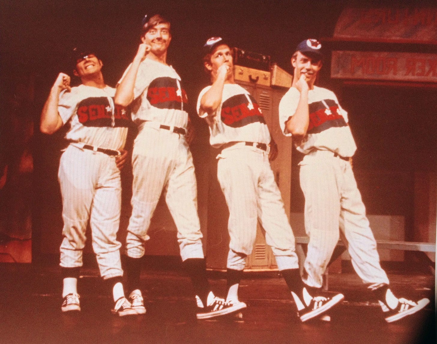 My story begins with this photograph from 1974: four young men in pretend baseball uniforms, standing on the stage of Mitchell Hall at the University of Delaware, all in identical poses - a classic choreographed musical theater tableau. The stage lights cast a warm glow. You can see the commitment in the faces, the unselfconscious joy of being twenty years old and getting paid summer stock wages to perform Damn Yankees and make the customers happy.